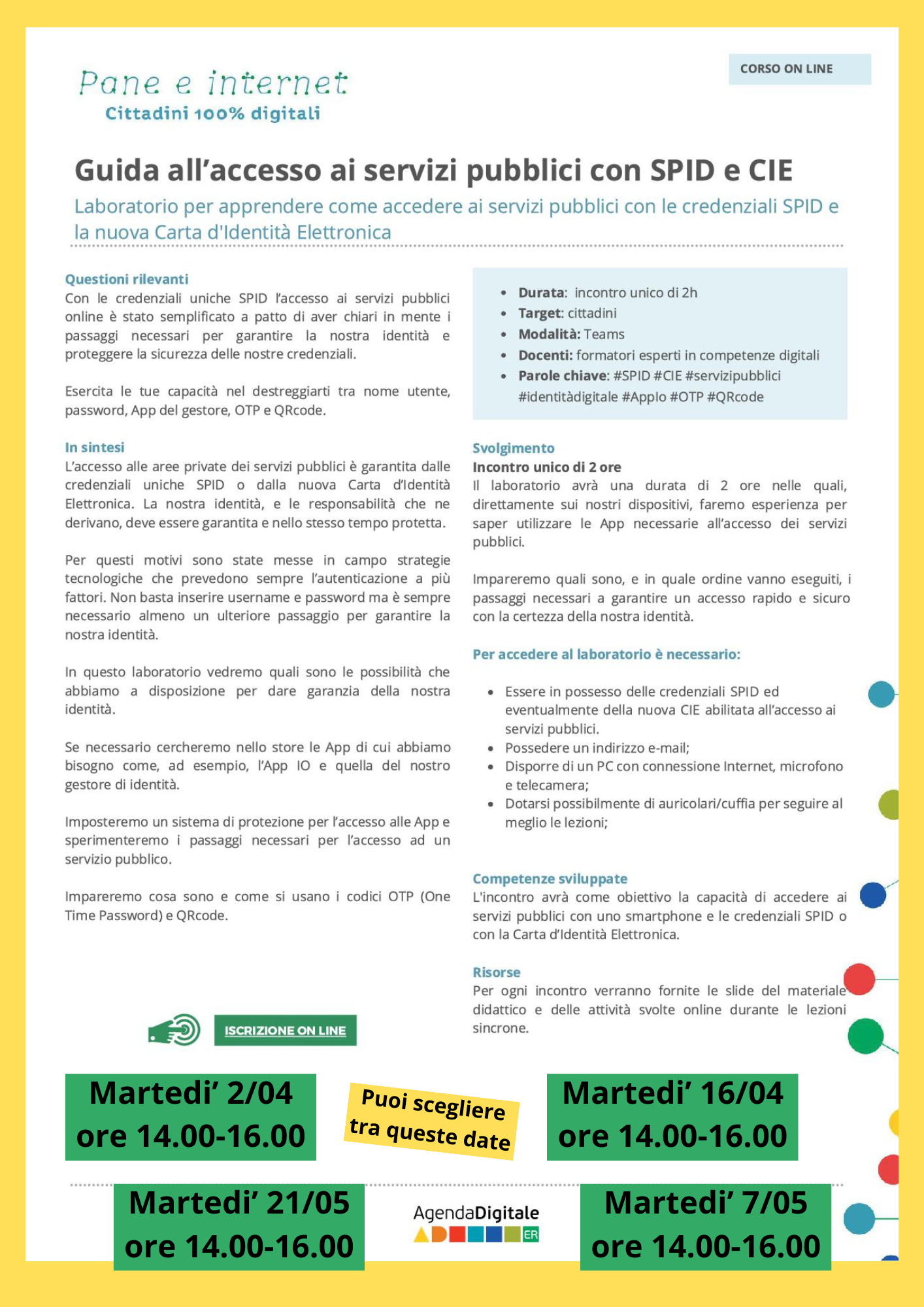 🔹 Guida all’accesso ai servizi pubblici con SPID e CIE (2h)- Con le credenziali uniche SPID l’accesso ai servizi pubblici online è stato semplificato a patto di aver chiari in mente i passaggi necessari per garantire la nostra identità e proteggere la sicurezza delle nostre credenziali. Esercita le tue capacità nel destreggiarti tra nome utente, password, App del gestore, OTP e QRcode.