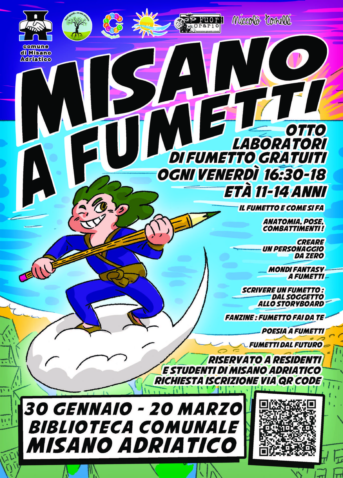 Sei un appassionato di storie, disegni e creatività? Hai tra gli 11 e i 14 anni? Torna il laboratorio di fumetto gratuito organizzato dal Comune di Misano Adriatico. Sotto la guida dell’esperto Niccolò Tonelli, imparerai le basi del fumetto e della sperimentazione editoriale, creando il tuo volume personale.
