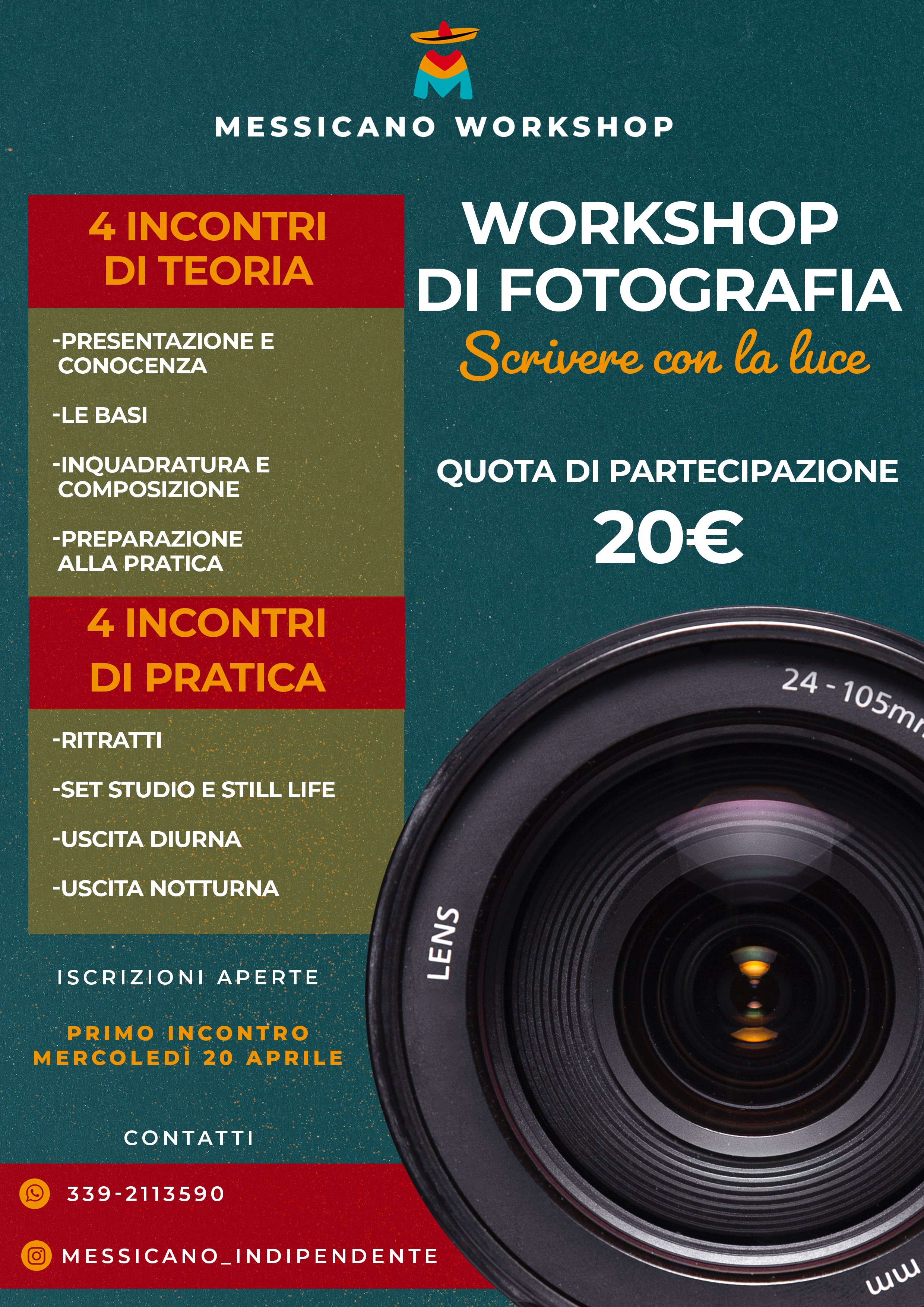 4 Incontri Teorici e 4 Incontri Pratici, anche in esterna in cui insieme affronteremo le regole base di scatto, la percezione dell’immagine e la composizione fotografica.