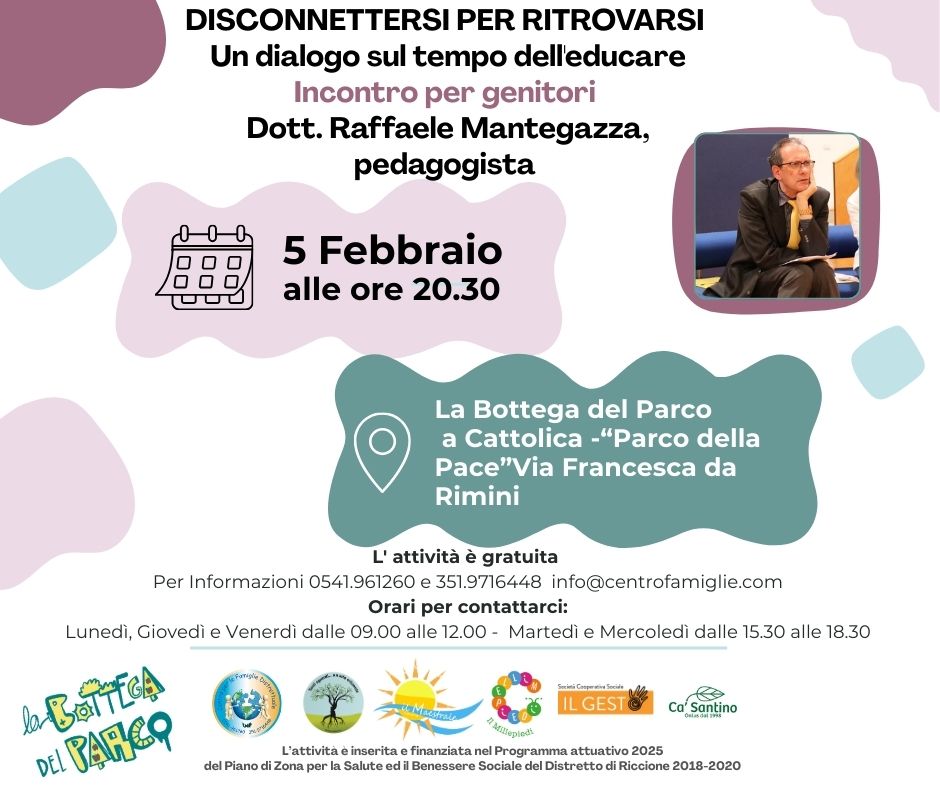 Il Centro per le Famiglie del Distretto di Riccione informa che Giovedì 5 febbraio 2026 alle ore 20.30 presso la Bottega del Parco, Parco della Pace, via Francesca da Rimini, Cattolica vi sarà un incontro per genitori dal titolo "Disconnettersi per ritrovarsi, un dialogo sul tempo dell'educare" a cura del dott. Raffaele Mantegazza, pedagogista.