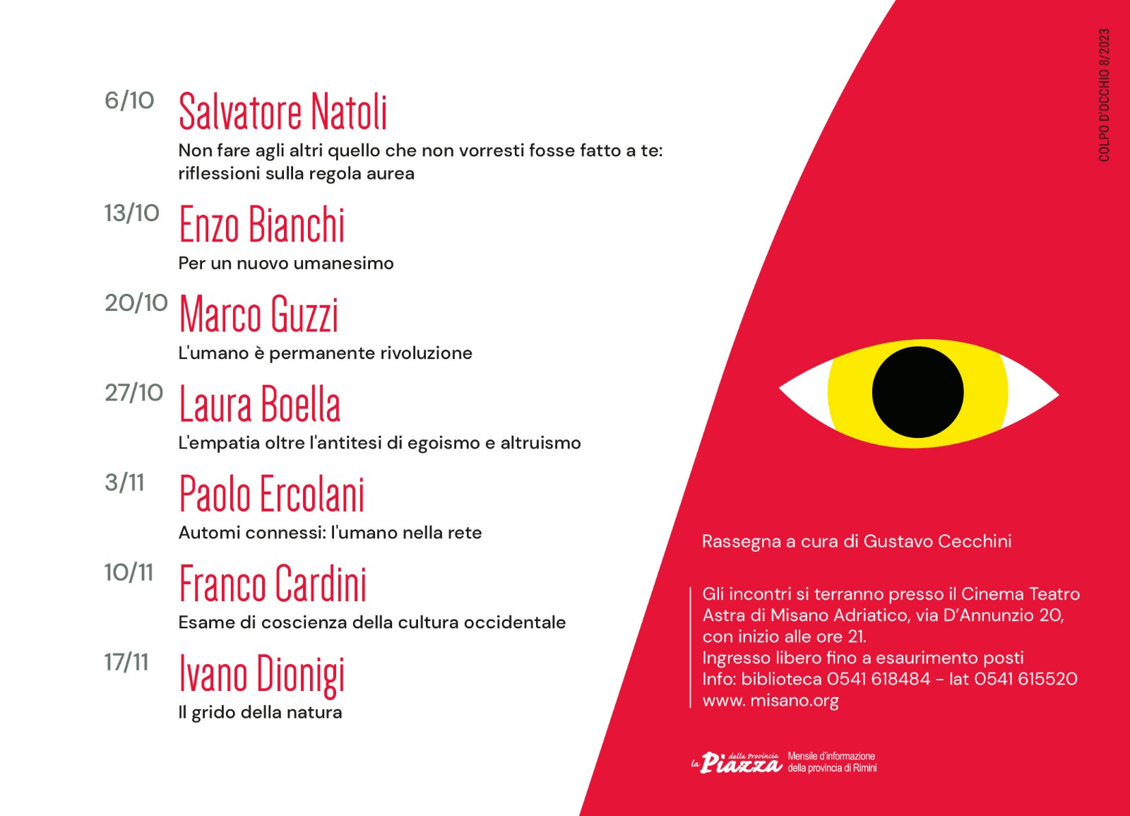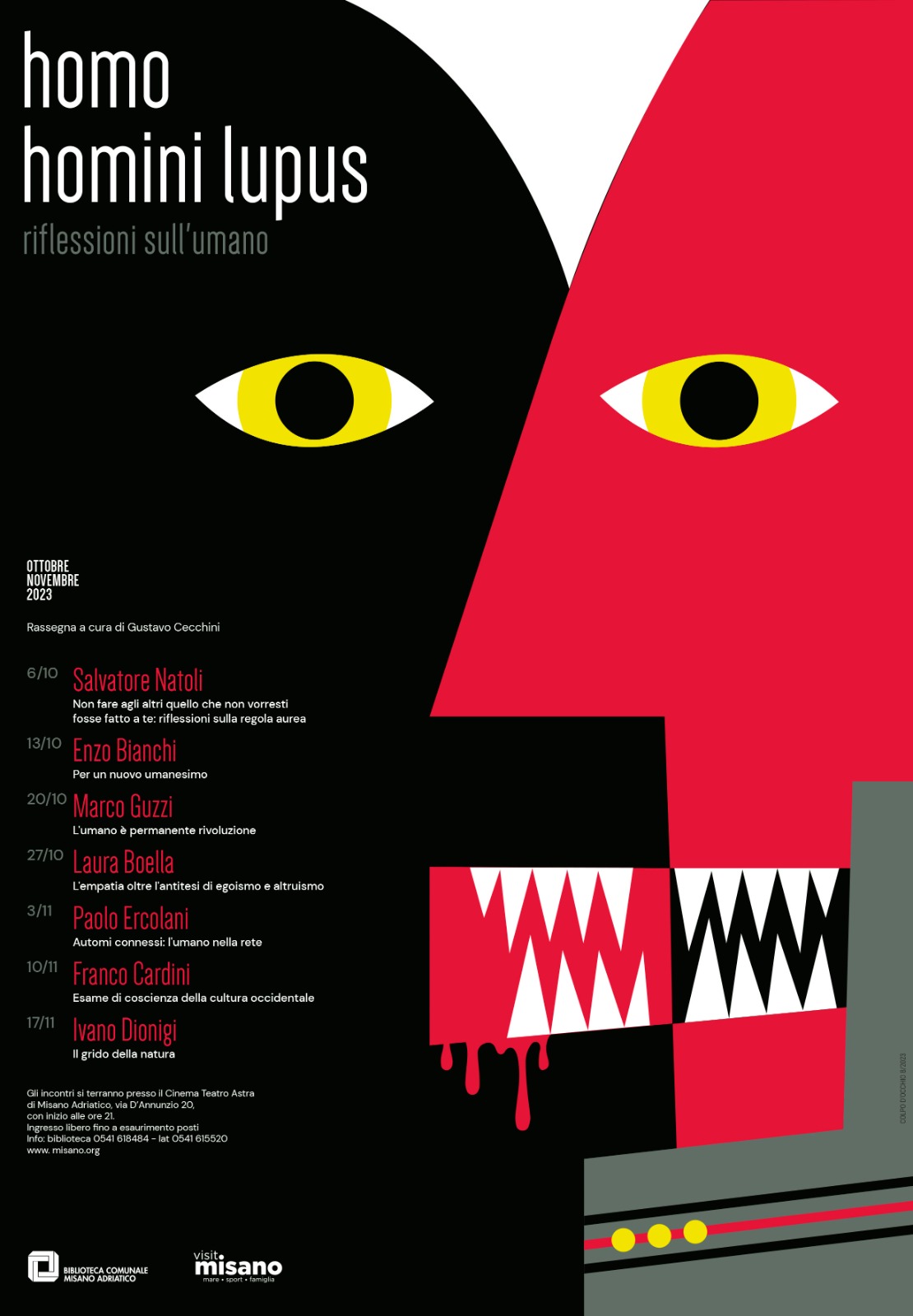 Siamo nati buoni o malvagi? Fino a che punto la frase di Plauto “homo homini lupus”, adottata da Hobbes, definisce davvero il rapporto tra gli uomini nello stato di natura? Di primo acchito, a guardarsi intorno, parrebbe di sì. Il mondo è divenuto un teatro di guerra, è in atto una competizione spietata e che dire di più. Ma come si comporterebbe l’uomo se vivesse senza alcuna imposizione sociale, facendo parlare soltanto la propria natura? È la domanda che si sono posti moltissimi tra filosofi e uomini di cultura di tutte le epoche, senza mai giungere ad una risposta univoca. È sufficiente guardarci attorno e riflettere su alcuni valori propagandati nel complesso dalla comunità mondiale, di cui facciamo parte, per intuire come antagonismo, violenza, prevaricazione, cinismo non siano affatto concetti estranei al terzo millennio. I famelici lupi di Hobbes continuano ad azzannarsi nella forma apparentemente più incivilita della competitività planetaria, in una antropologia che riduce l'essere umano ad atomo competitivo, a oltreuomo con volontà di potenza individualistica illimitata. Ed è proprio a questo tema che è dedicata la nuova rassegna filosofica misanese curata da Gustavo Cecchini dal titolo : HOMO HOMINI LUPUS – Riflessioni sull'umano che dal 6 Ottobre sarà punto di riferimento per appassionati di speculazione filosofica di tutta la riviera romagnola e oltre. Sei appuntamenti con pensatori di eccellenza per riflettere su ciò che ci rende umani.