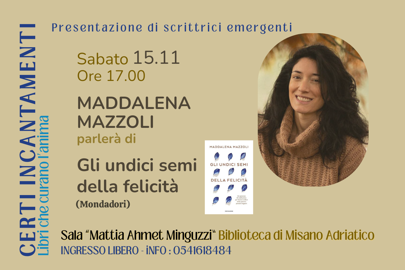 La biblioteca incontra l'esperta di meditazione e mindfulness Maddalena Mazzoli Vandi che presenterà il suo libro "Gli undici semi della felicità" (Mondadori), un saggio agevole ed efficace che conduce i lettori verso il benessere interiore attraverso la spiegazione e l'invito alla prova di varie pratiche di meditazione.