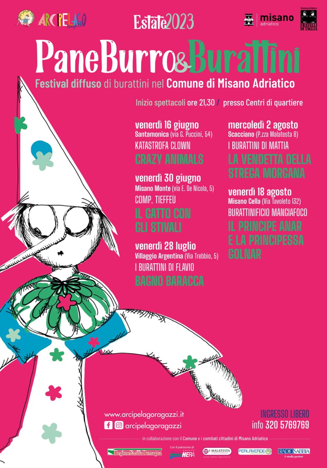 Dal 16 giugno al 18 agosto 2023, a Misano Adriatico "Pane Burro & Burattini": una serie di 5 appuntamenti per bambini e ragazzi.