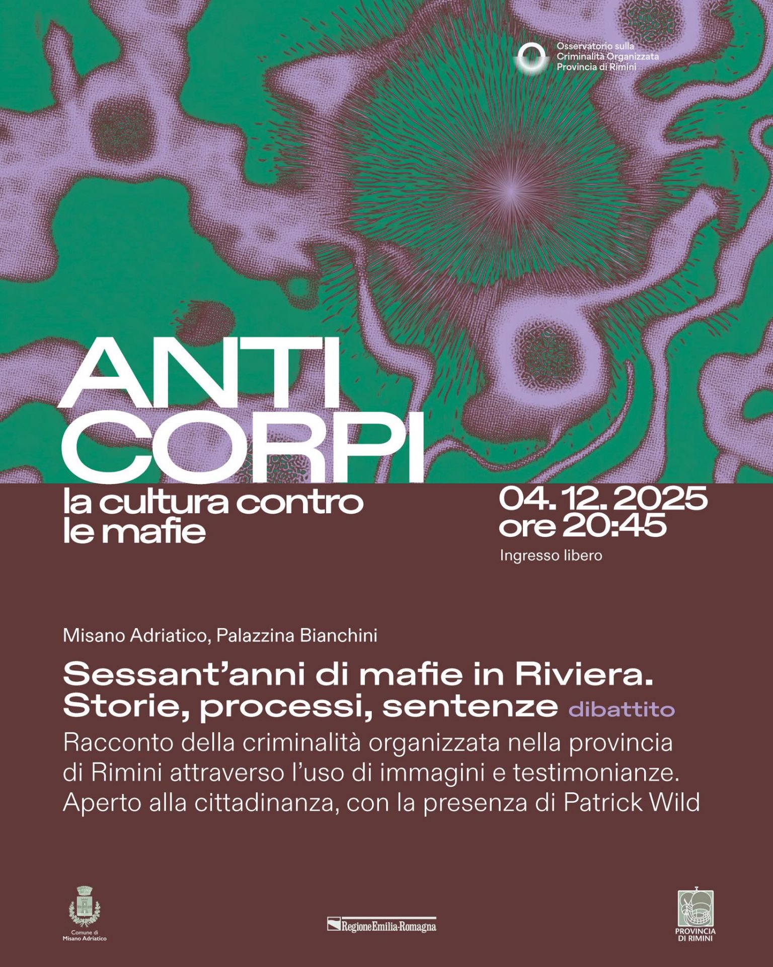 Con la presenza di Patrick Wild, l’incontro ripercorrerà la presenza delle mafie nella provincia di Rimini attraverso immagini, testimonianze e materiali audiovisivi, con estratti da documentari come Romagna Nostra ed Emilia-Romagna Connection, per ricostruire una storia complessa che appartiene al territorio più di quanto spesso si immagini.