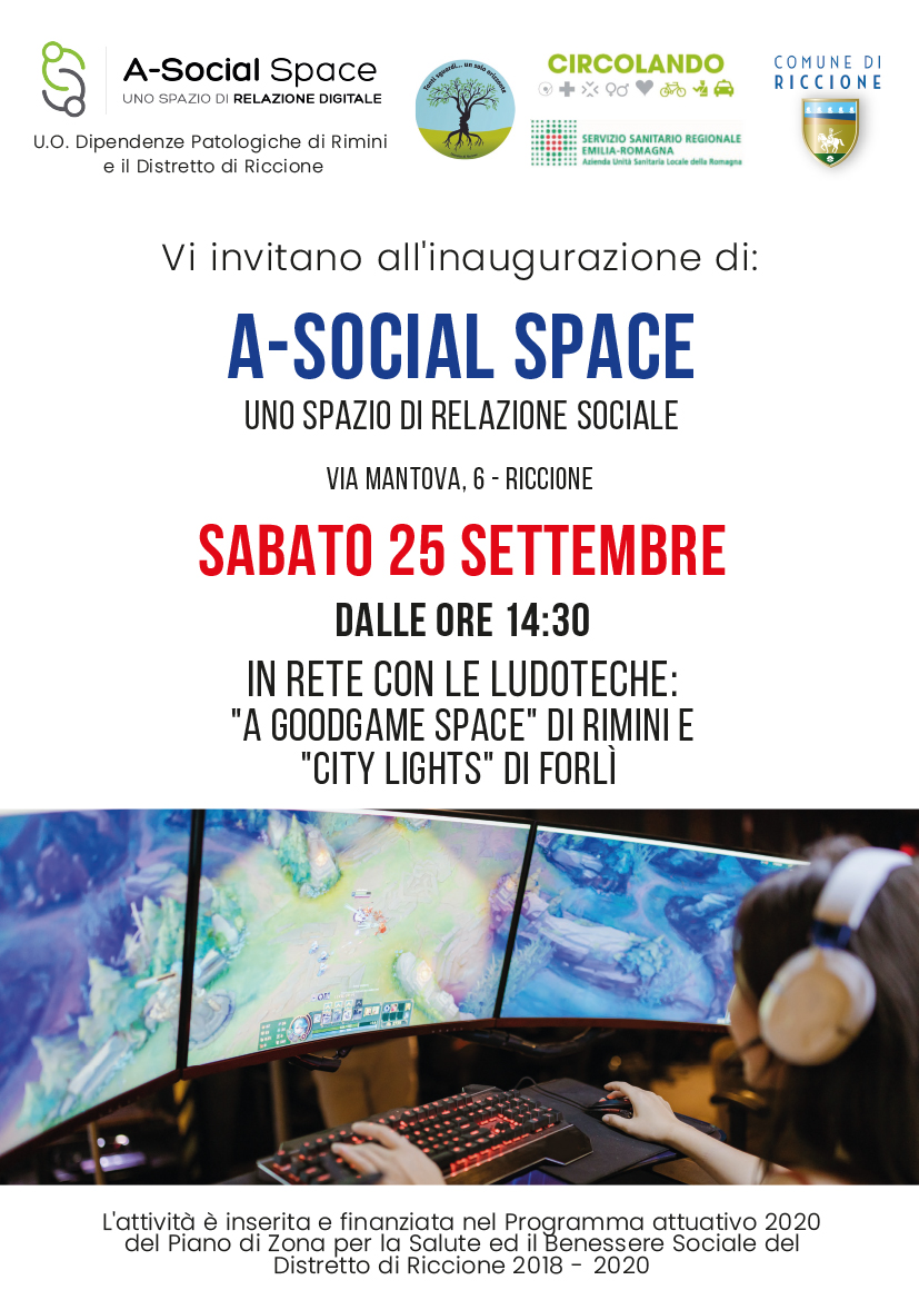 Sabato 25 settembre, alle ore 14,30, in via Mantova 6, a Riccione, verrà inaugurato A-Social Space di Riccione, uno Spazio di Relazione-Digitale, promosso dalla U.O. Dipendenze Patologiche Ambito di Rimini in collaborazione con il Distretto di Riccione.