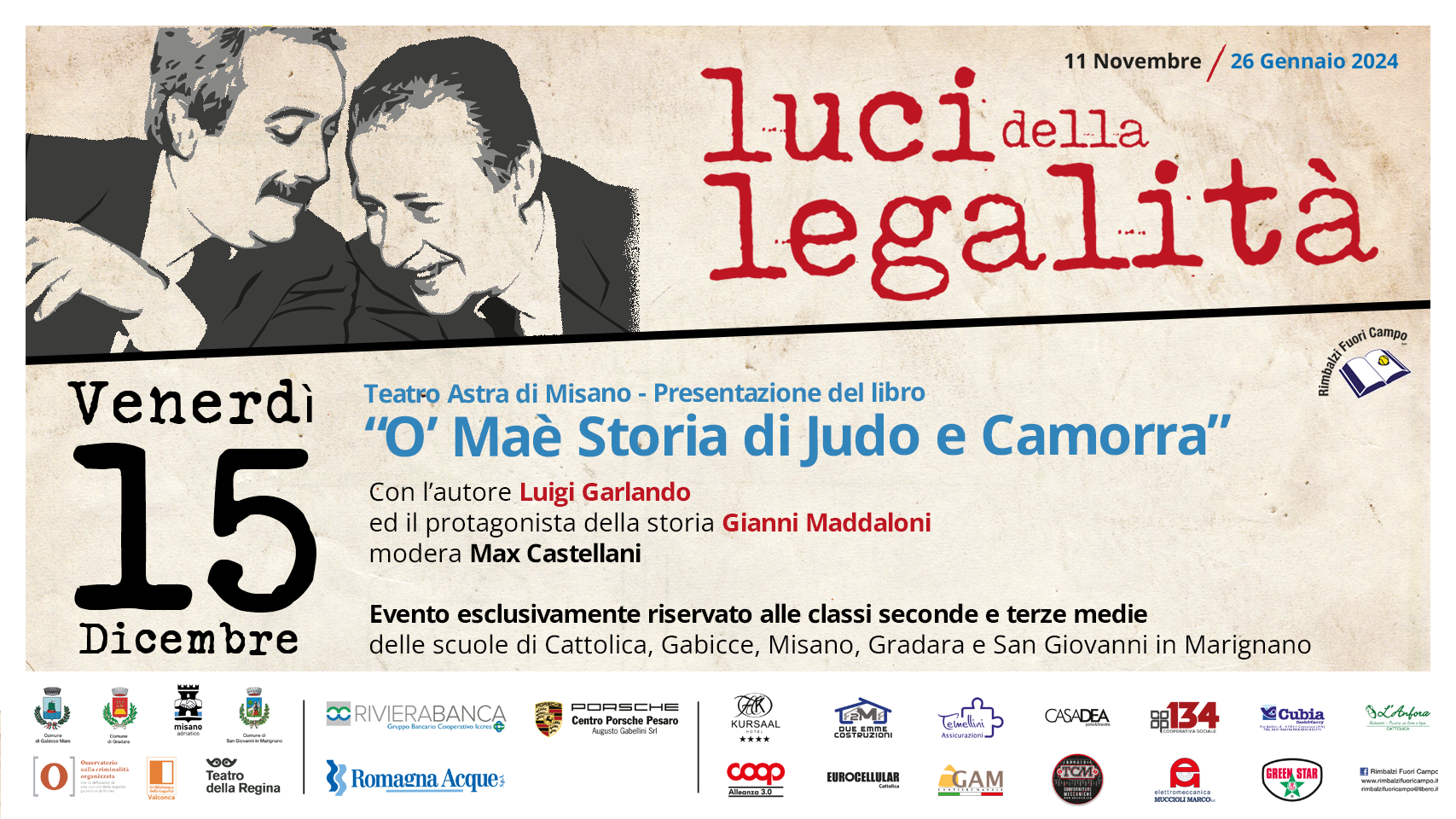 Nell'ambito del progetto "Luci e legalità" venerdì 15 dicembre è prevista la presentazione del libro "'O Maé Storia di Judo e Camorra" presso il Cinema Teatro Astra. Saranno presenti all'incontro anche l'autore Luigi Garlando e il protagonista del racconto Gianni Maddaloni. Modera Max Castellani.