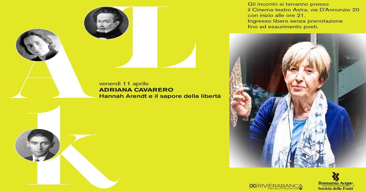Nel secondo appuntamento, venerdì 11 Aprile, sarà protagonista la filosofa Adriana Cavarero con una lectio dal titolo : Hanna Arendt e il sapore della libertà.