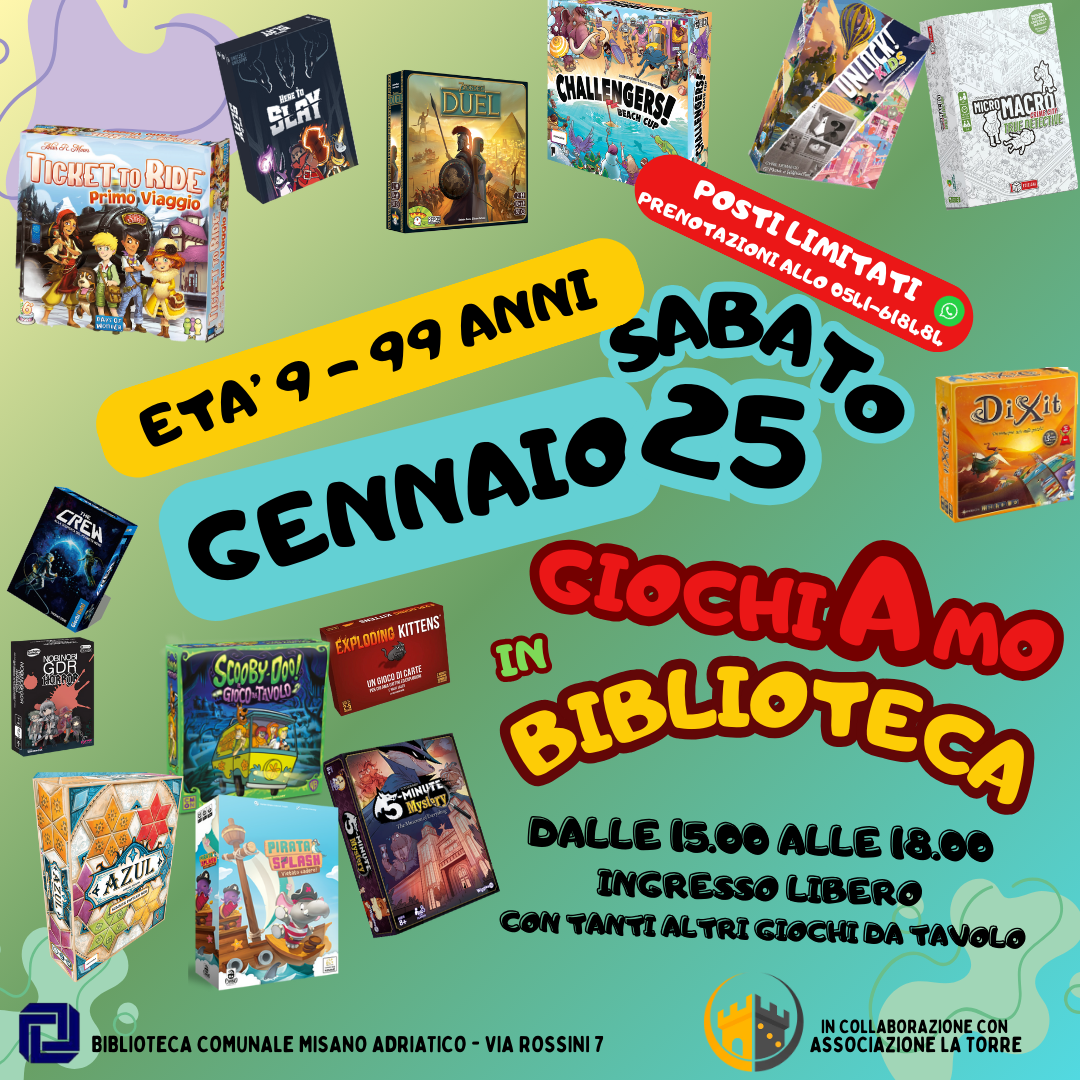 La biblioteca di Misano ti invita per un'apertura STRAORDINARIA dedicata ai GIOCHI DA TAVOLO sabato 25 Gennaio dalle 15.00 alle 18.00