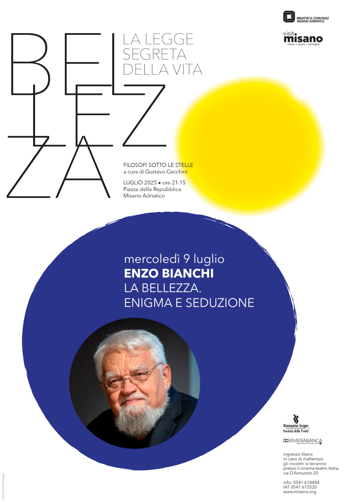 "La Bellezza, enigma e seduzione” è il titolo dell’atteso appuntamento Enzo Bianchi, in programma domani sera alle 21:15 in Piazza Repubblica a Misano. L’intervento del monaco laico e teologo fa parte della rassegna Filosofi sotto le stelle sul tema ‘Bellezza, legge segreta della vita’.