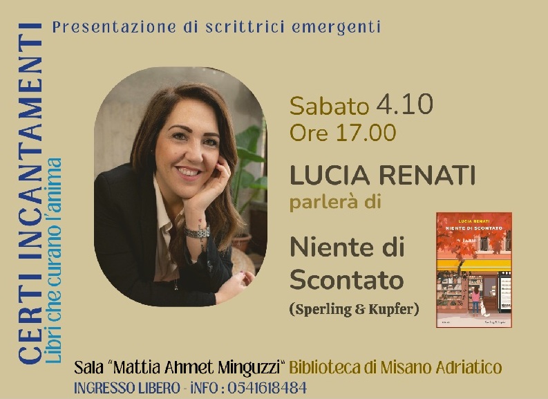 La biblioteca propone un pomeriggio con la scrittrice e giornalista riminese Lucia Renati che presenterà il suo nuovo romanzo "Niente di scontato", edito da Sperling & Kupfer.