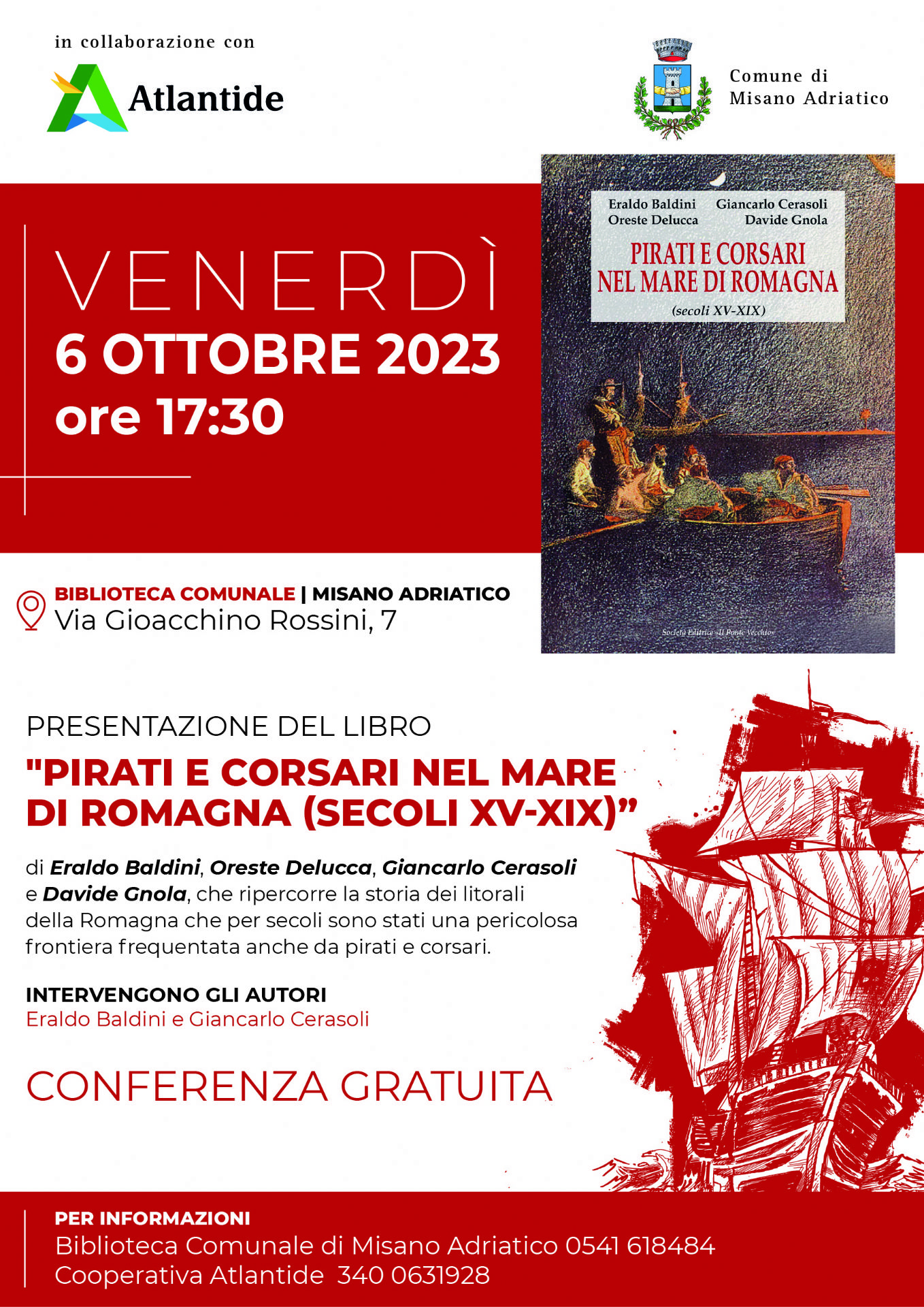 Alle ore 17:30 - Presentazione del libro "Pirati e corsari nel mare di Romagna (secoli XV-XIX)", con intervento degli autori Eraldo Baldini e Giancarlo Cerasoli.
