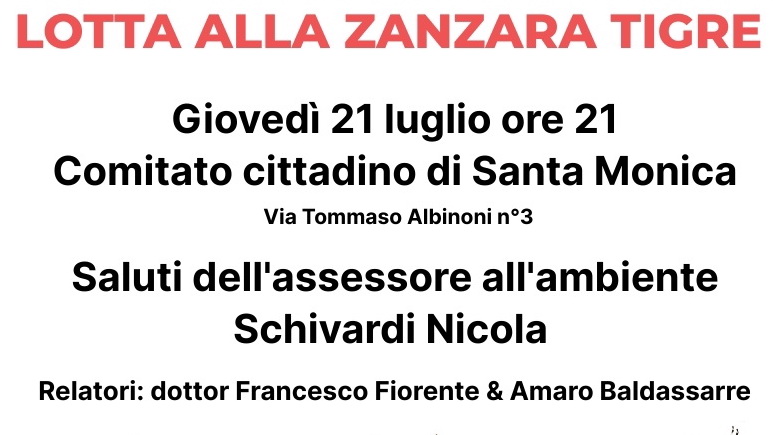 Dopo i saluti dell’assessore all’ambiente Nicola Schivardi, interverranno come relatori il dottor Francesco Fiorente e Amaro Baldassarre che spiegheranno come prevenire la proliferazione del fastidioso insetto e come contrastarlo attraverso la lotta larvicida e adulticida.